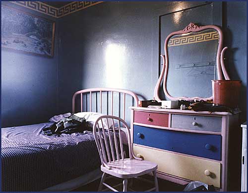 My bedroom $12 night, Sudbury Ontario Keep this place: These images were made in the early to mid 1980's. They were all shot using available light and 4x5 sheet film. The prints are all 16x 20 inches or less. The following text is from an artist's statement that was used as a preface to the exhibition of the same name. For the most part the pictures are (were) taken in taverns, public houses and their attendant living spaces in a variety of locales from Ottawa westward. They are all in colour and are selected from a larger body of work that I photographed during the last two years. The pictures are intended to operate on several levels and will be misread if they are examined only for their "documentary" properties. They are an appreciation of the decisions that people made in claiming these spaces for their own use rather than a critique or an exposé. Within the images there are a variety of renderings on a common theme that were generated by the practical needs (functions) of these rooms. The rooms themselves are an architecture of necessity, but I have tried to photograph them with the same sense of place, strength and dignity that another (commissioned) photographer might bring to corporate spaces. Another important aspect of the work is the extended metaphor that uses different locations, common items of furniture, and the play of light to make an emotive comparison with myself, the viewer and the rooms I have chosen. It is true that the rooms are often small and confining, but at the same time I like to think that they are transparent. JW 1985 The show that I circulated under this name was composed of about 35-25 prints depending on the venue. These prints were edited from hundreds of different candidate photographs.