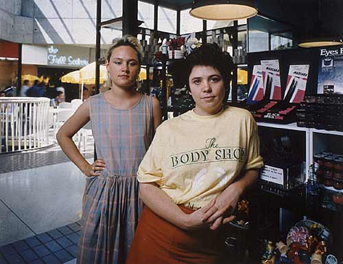 from next to the cash . . . in The Body Shop Retail industry workers from next to the cash . . . and some resource industry workers portraits. These images were made in the late 1980's. They were shot with the use of portable studio flash equipment and 4x5 sheet film and polaroid tests. The prints are all 16x 20 inches . The following text is from an artist's statement was used to introduce these images at the time... the bracketed text has been added later to clarify the somewhat poor writing I am working (was) with large format colour portraits of people in their workplaces. Of two major portfolios the first, titled next to the cash . . .is taken from about 70 images of salespeople in a large shopping mall. All the stores are franchises or parts of a larger organization and are "pan-canadian" in the sense that branch outlets can be found in any major shopping centre. The products and displays are part of a larger marketing scheme and are rarely controlled at the local level. The people ( the pictures of them) who sell the goods are very different from the photographic cliché of the merchant as individualist who (rendered in black and white) stands proudly among bolts of cloth and wooden counters in a store that is probably his or her life's work. Today, many merchants are as much a part of the marketing process as the packages for the products that they sell. An employee's control over their work environment in a franchised store is comparitive small, often to the extent that their dress and deportment are dictated by the merchandiser (ie the marketing strategies set down for the franchise owner.) Demographically, sales staff in malls are young, mainly women and well dressed, and work for below average wages. Because they (my subjects) were strangers to me, it was impossible to make the intimate likenesses often experienced in (other ) portraits. These people are important and I wanted to treat them individually when taking their picture. We used Polaroid test shots to arrive at mutually agreeable poses. For the most part we adopted a treatment akin to the images of "moguls of industry" that haunt the pages of annual reports which equate executives with their place of work by making environmental portraits of them in command of the workplace . The salespeople in "next to the cash . . ." are at the interface of our consumer culture and the public. They are in effect ambassadors to ourselves. The second portfolio is a study of workers at the start of production , rather than at the end. Our primary industries are resource based and figure largely in the romantic self image of Canadians. Historically , our culture and livelihoods have been closely tied to our landscape, and our somewhat derogatory label of ourselves as "hewers of wood and drawers of water" has much truth in it. I have been (was) photographing people in industries such as fur processing, lumber, mining, fishing and farming as a way of learning who does this work and what these places are like. This work continues and is still untitled.* JW 1987