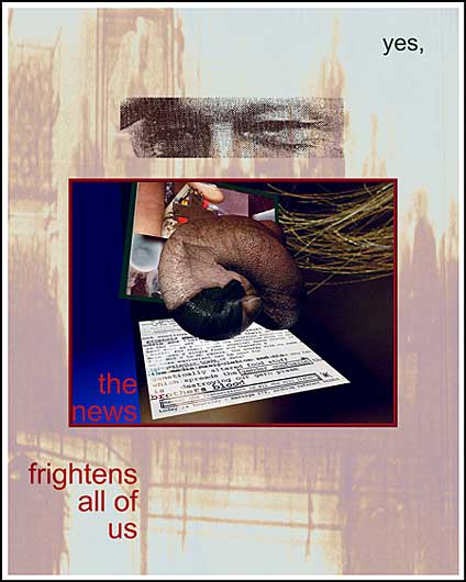 " x ray image of escaping refugees and warning from a paranoid schizophrenic " From the exhibition "Conjointe" - external dimensions of frame 36" wide x 46" height, inkjet print, 1999.